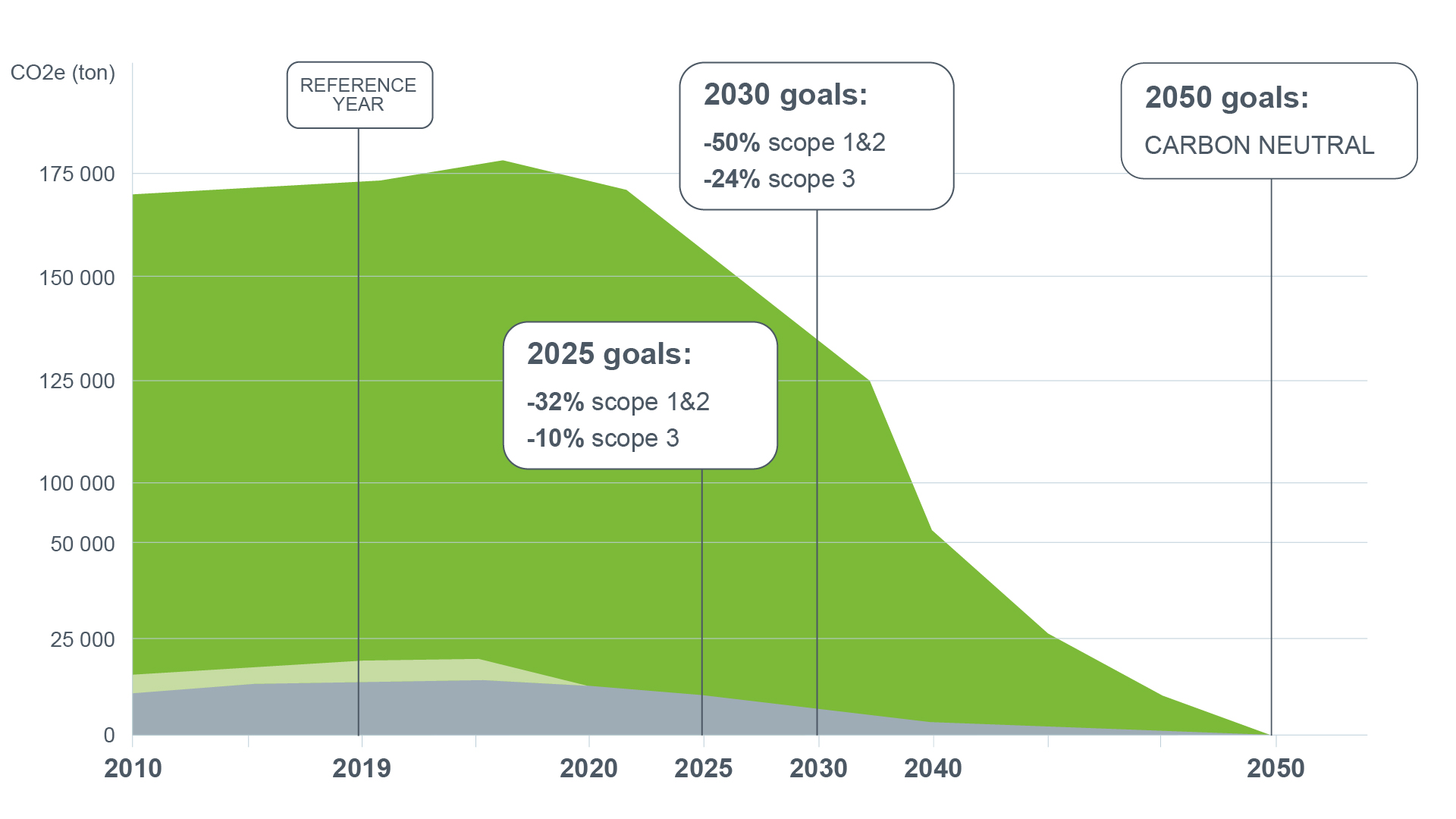 We are working hard to reach carbon neutrality by 2050. You might notice the percentages showing our progress. They’re measured in comparison to our emissions in 2019.